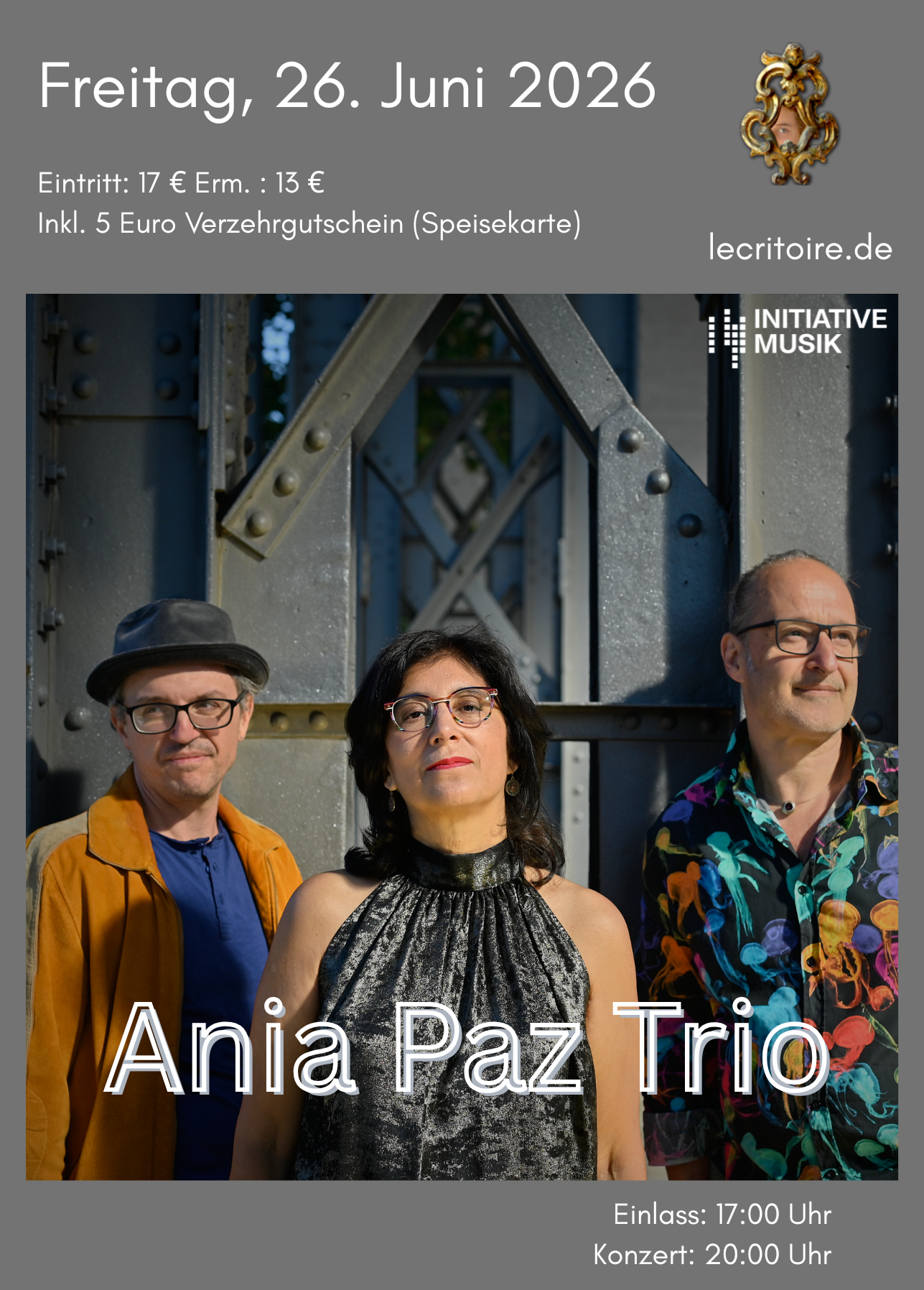 Wir öffnen um 17:00 Uhr. Das Konzert beginnt um 20:00 Uhr. Sie können vor dem Konzert und nach dem Konzert unsere Spezialitäten von Quiches und Obst-tartes oder Crumble bestellen. Wir schließen um 22:30 Uhr!